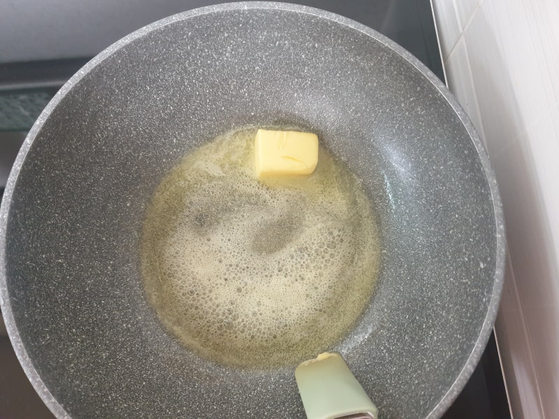 본격적인 요리를 시작하겠습니다. 웍이나 팬에 버터 한 덩어리를 넣고 녹입니다.