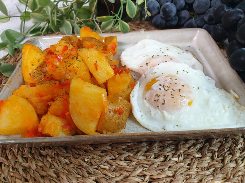 1-2인분 큰 감자 2개 양파 1/2개 파프리카 1/2개 소금 한 꼬집 큰 패트 버터 1개 마늘 1/2큰술 파프리카 1큰술 계란 2개